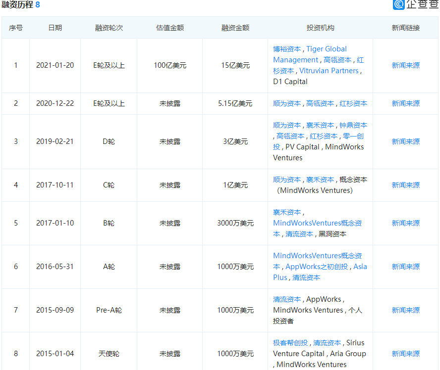 据企查查数据,成立至今货拉拉已完成8轮融资,最近一轮由博裕资本、高瓴资本等知名投资机构投资的15亿美元E轮以上的募资,估值达到了100亿美元。