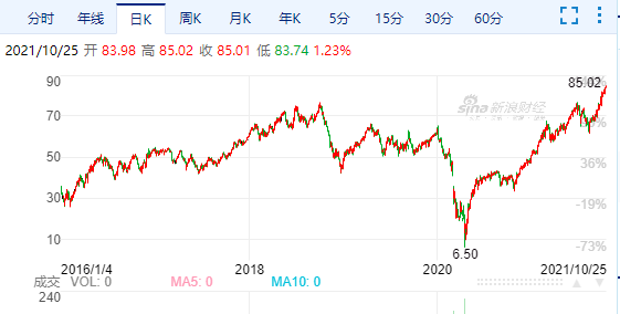 WTI原油期货站上85美元/桶,续刷2014年10月以来新高。