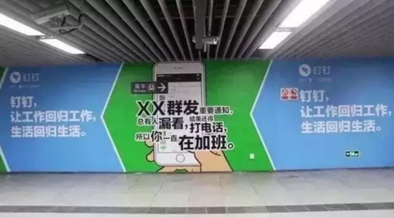 另外,这不是钉钉第一次对微信下手,根据微信公众号“营销新榜样”的报道,在4月12日,在离腾讯总部最近的地铁站深大站的走道两侧墙壁上,出现了阿里钉钉的巨幅广告,文案如:“用XX群发重要通知,总有人漏看,还是要打带花确认,所以你一直在加班。”“用XX来开会,时间总是被浪费,所以你一直在加班。”“工作时用XX,总是被琐事八卦分神,所以你一直在加班。”“发X信给老板,总是分不清他是没看到,还是假装没看见,所以你一直在加班。”