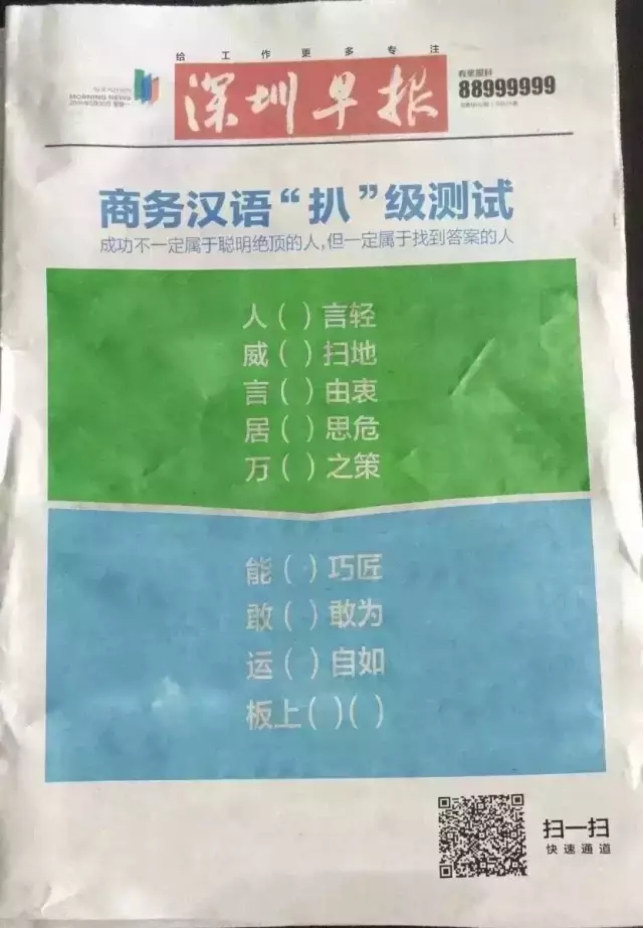据悉,在《深圳早纸》还有另一版钉钉广告,以填空的形式展现,把空格里的字填出来连成一句话是:“微信不安全,工作转钉钉。”目前这份广告还无法准确核实是不是钉钉同一天发出的。