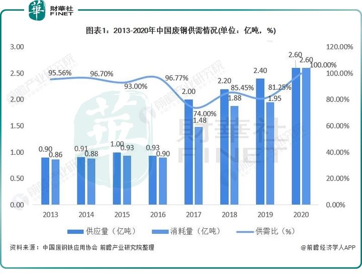根据中国废钢铁应用协会显示,2020年我国废钢总供应量为2.60亿吨,同比增加约2000万;2020年全国废钢铁消耗总量2.60亿吨,同比增加6500万吨。由此可见,需求端增速明显加快。