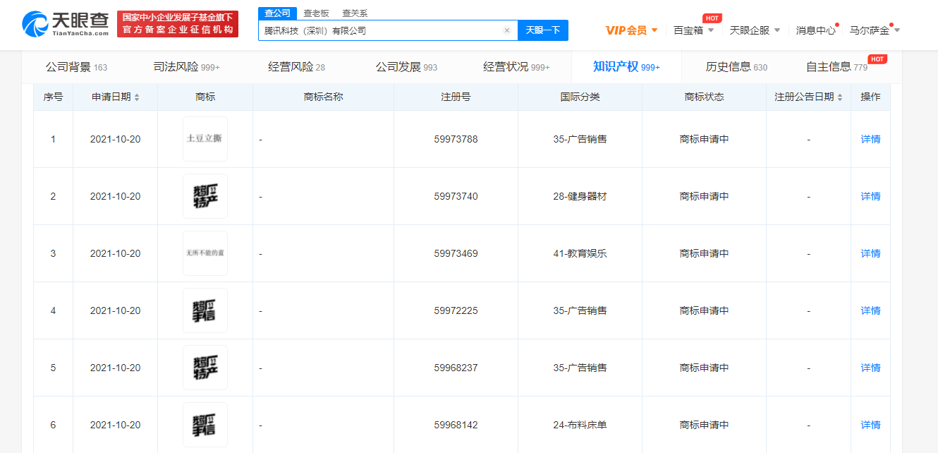 天眼查App显示,近日,腾讯科技(深圳)有限公司申请注册“土豆立撕”商标,国际分类为科学仪器、广告销售等,目前商标状态为申请中。