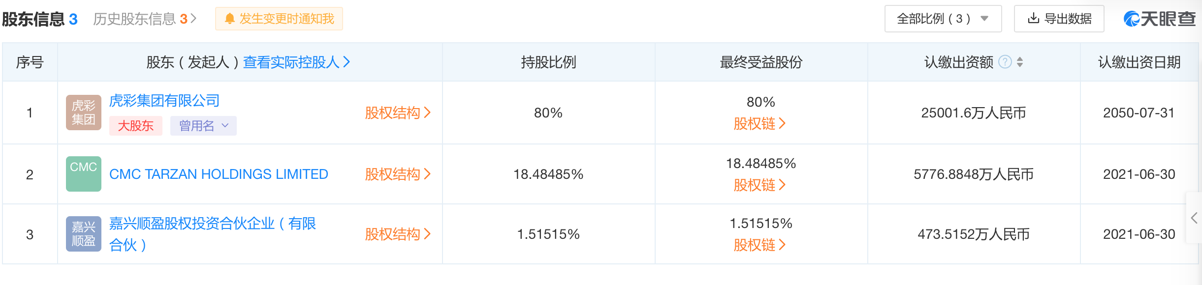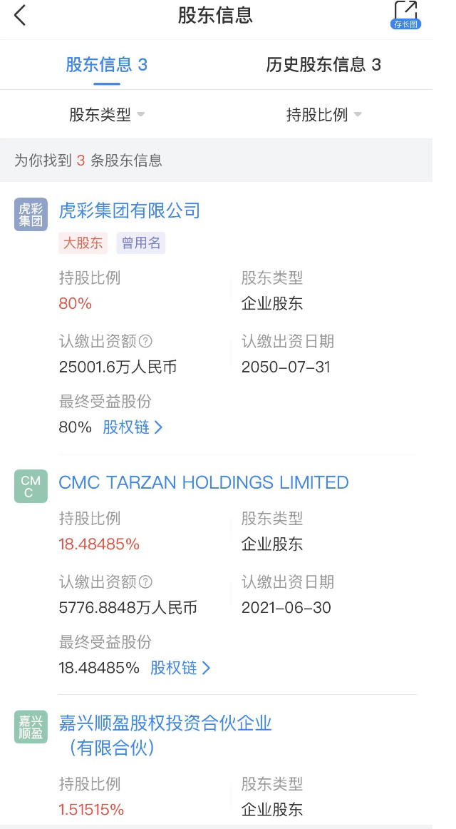 根据天眼查显示,如今的泰山啤酒第一大股东为虎彩集团有限公司,持股80%;CMC TARZAN为第二大股东,持股18.48485%;嘉兴顺盈股权投资合伙企业(有限合伙)为第三大股东,持股1.51515%。