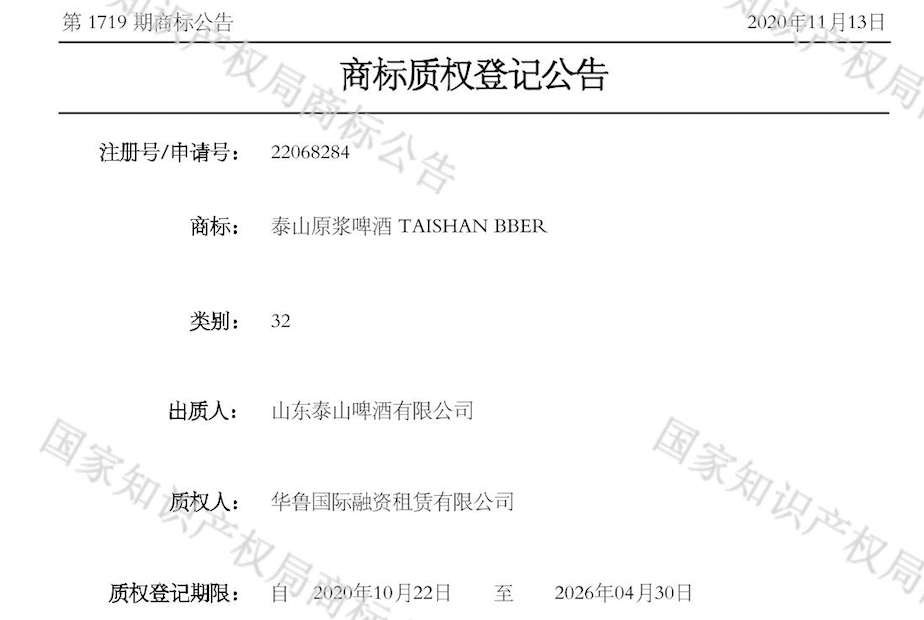 10月22日,界面记者从中国商标网查询获悉,包括“泰山”“泰山原浆啤酒TAISHAN BBER”“泰山精酿啤酒 TAISHAN CRAFT”在内的28个商标均已质押给华鲁国际融资租赁有限公司(以下简称“华鲁租赁”),职权登记期限均为2020年10月22日至2026年4月30日。
