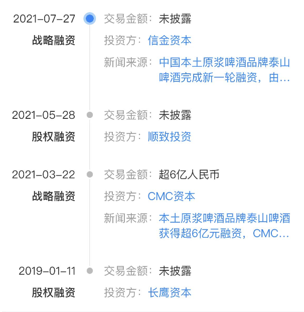 3月,泰山啤酒完成超6亿元融资。据了解,此轮融资为泰山啤酒首次面向民间资本的股权融资,由CMC资本独家投资;7月27日,泰山啤酒完成新一轮融资,由中信系投资平台信金资本独家战略加持。