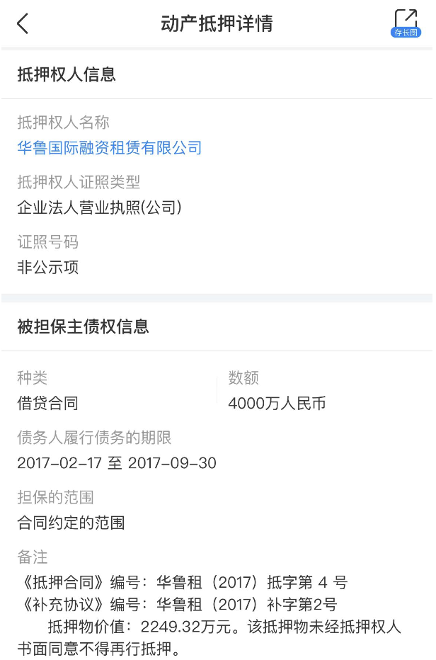 其中,在所有抵押里最引人注意的,便是2017年2月,泰山啤酒将9套价值2249.32万元的机器设备以借贷合同方式抵押给华鲁租赁,抵押金额4000万元。