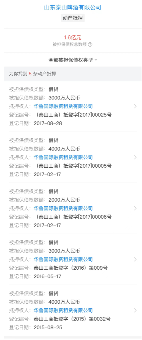 近年来华鲁租赁长期以来都作为泰山啤酒的重要融资渠道出现在大众视野。界面记者在天眼查上发现,不仅仅是商标进行质押,从2015年起,泰山啤酒便不断将机器设备抵押给华鲁租赁,至今总计1.6亿元。