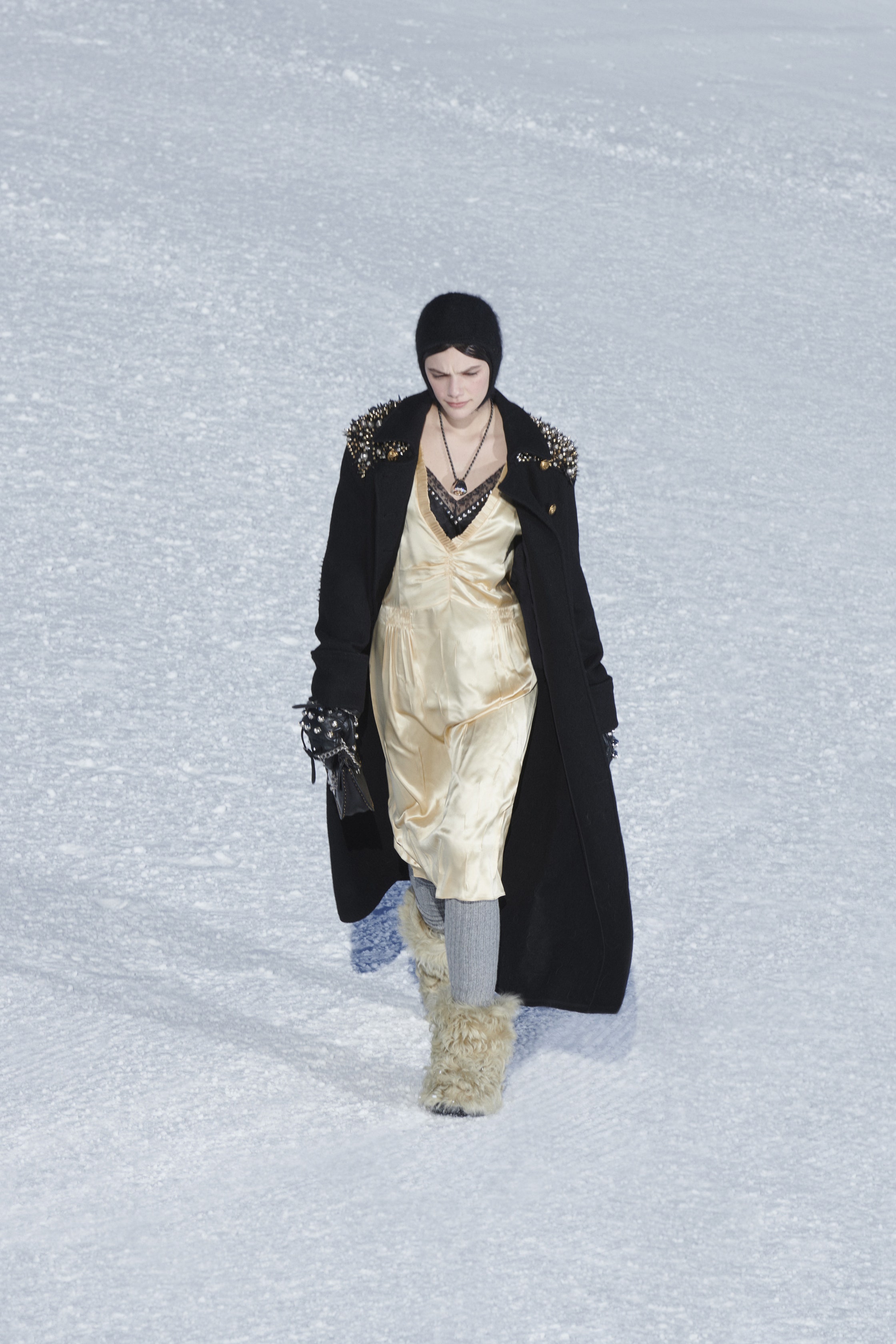 在2021秋冬系列中,MIU MIU将滑雪服等运动服元素与时尚设计相融合,模特从雪地里走来,带来了保暖舒适度满分的秋冬服饰。在本季鞋履中,大胆夸张的毛绒靴和以滑雪服为灵感的尼龙短靴都是不得不提的存在。