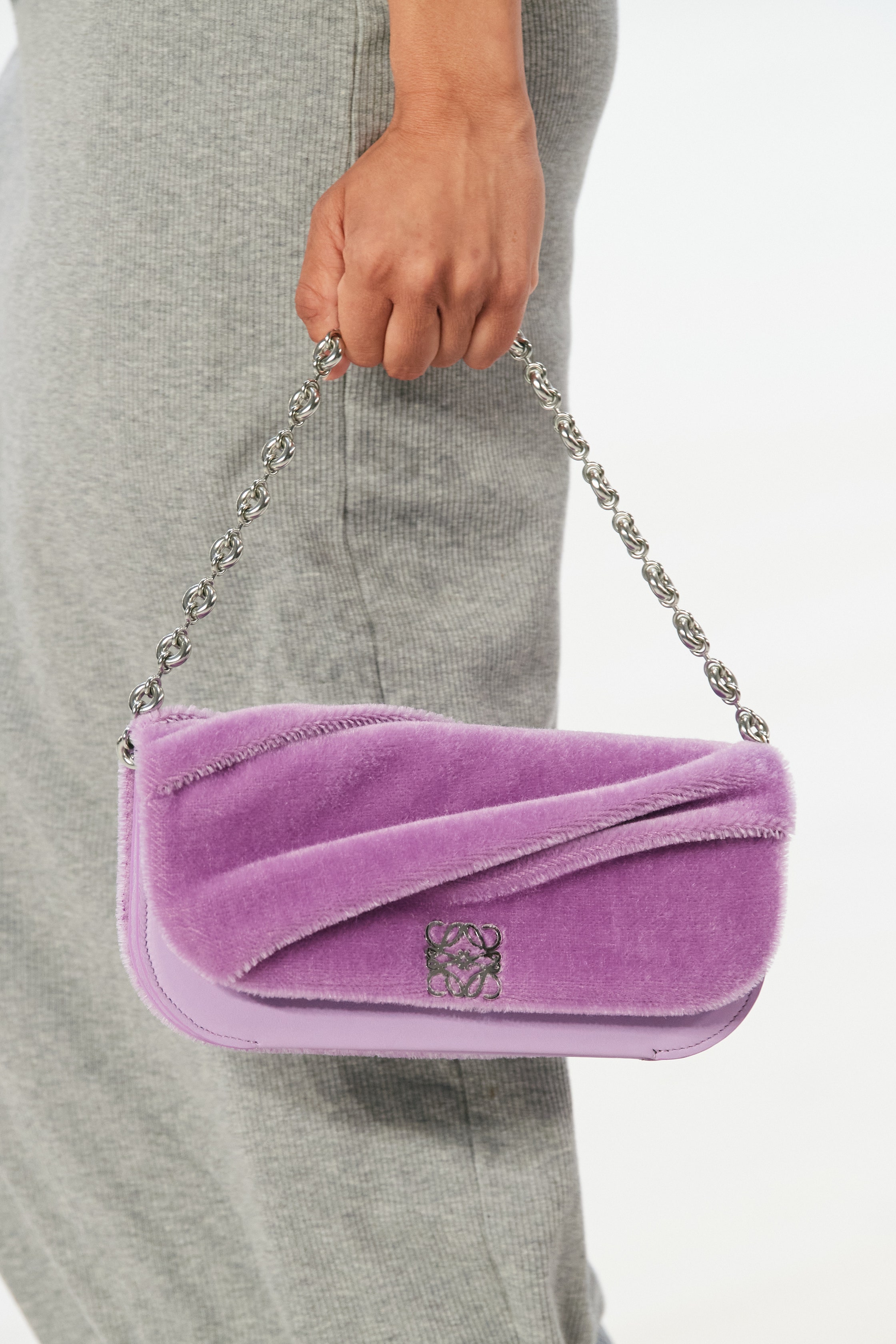 包身挺阔顺滑的丝绸小牛皮被替换成了柔软舒适的丝绒材质,方正经典的廓形也被拉长成为更加细长的优雅形态。此外,Jonathan Anderson还为这款手袋添加了更多精致细节,比如绒布面料的旋转设计和丝毫不显笨重的金属链等等。