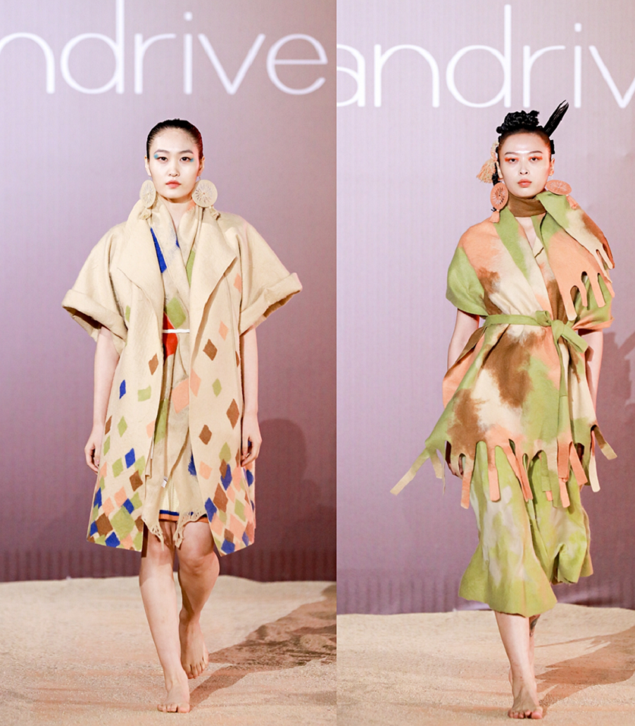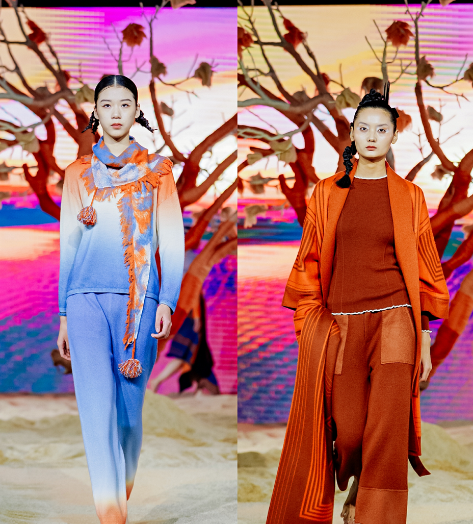 秀场用来自内蒙沙漠的沙粒铺满了整座T台,傲立在T台正中心的胡杨树,用斑斓的羊绒纱线缠绕和羊绒原绒点缀,寓意着干涸大漠中的顽强和勃勃生机。