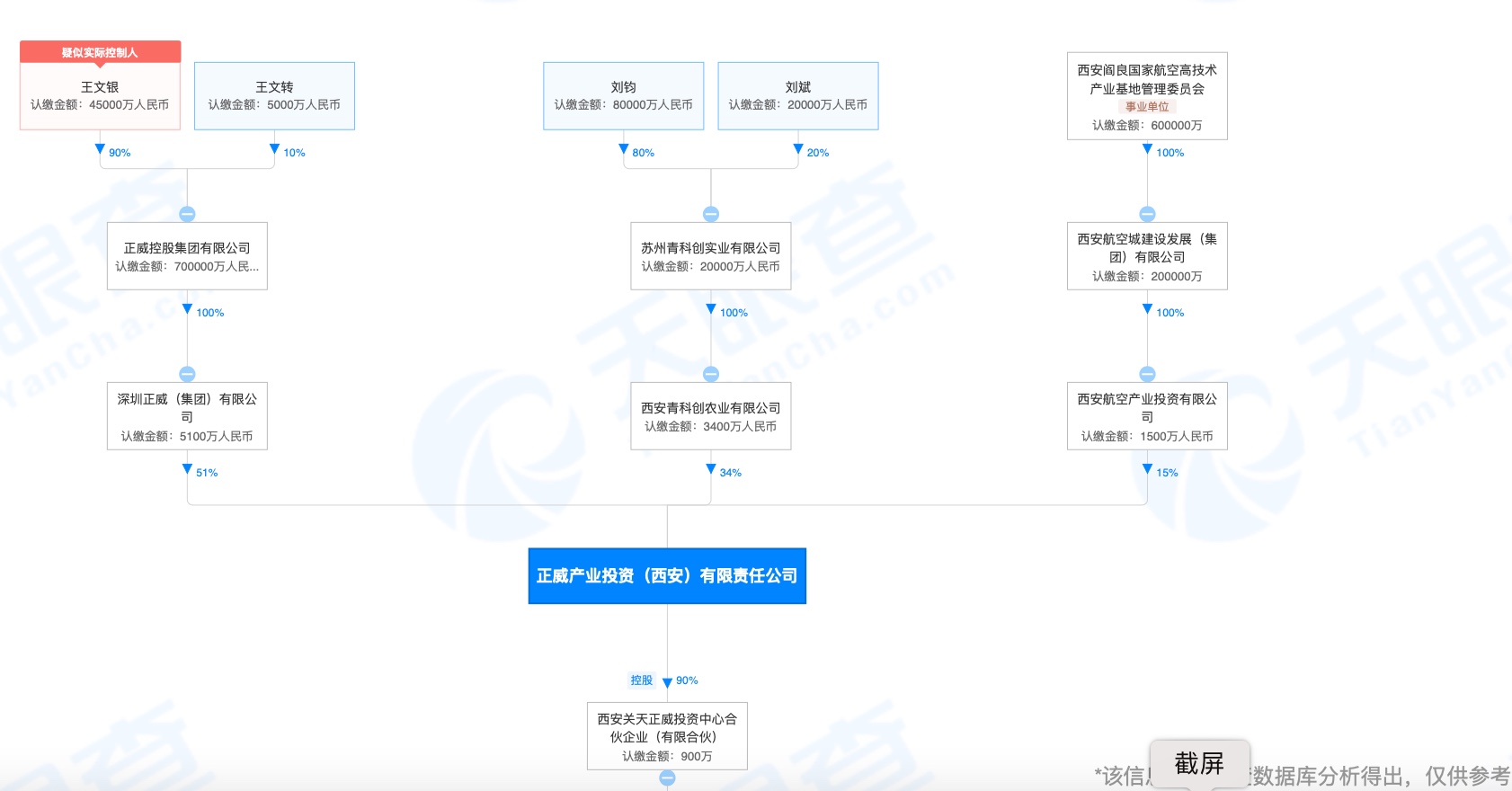 除了金竺实业,刘钧通过苏州青科创控股西安青科创农业有限公司、晗贵(上海)贸易有限公司、伊耿(上海)贸易有限公司等。其中,西安青科创农业有限公司参股了“正威产业投资(西安)有限责任公司”,持股34%,是最为引人关注的地方。正是这项持股,把刘钧和正威集团的王文银联系到一起。