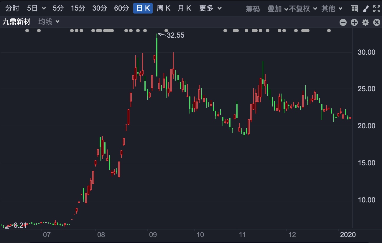 在这4个月中,九鼎新材的股价出现了一轮“波澜壮阔”的上涨,从7月下旬的7元附近(不复权)经历很多的涨停板之后,在9月触及当时的最高价32.55元(不复权),期间累计涨幅接近4倍。并且,在2019年12月相关股份完成过户和实控人变更后,股价仍保持在20元以上。正是九鼎新材股价的这一轮上涨,王文银及其正威集团上了热搜,名声大振。