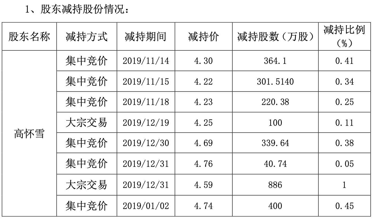 此外,2021年3月5日和8日,高怀雪两次通过大宗交易减持股份合计35,150,222 股,约占公司总股本比例为 3.97%。