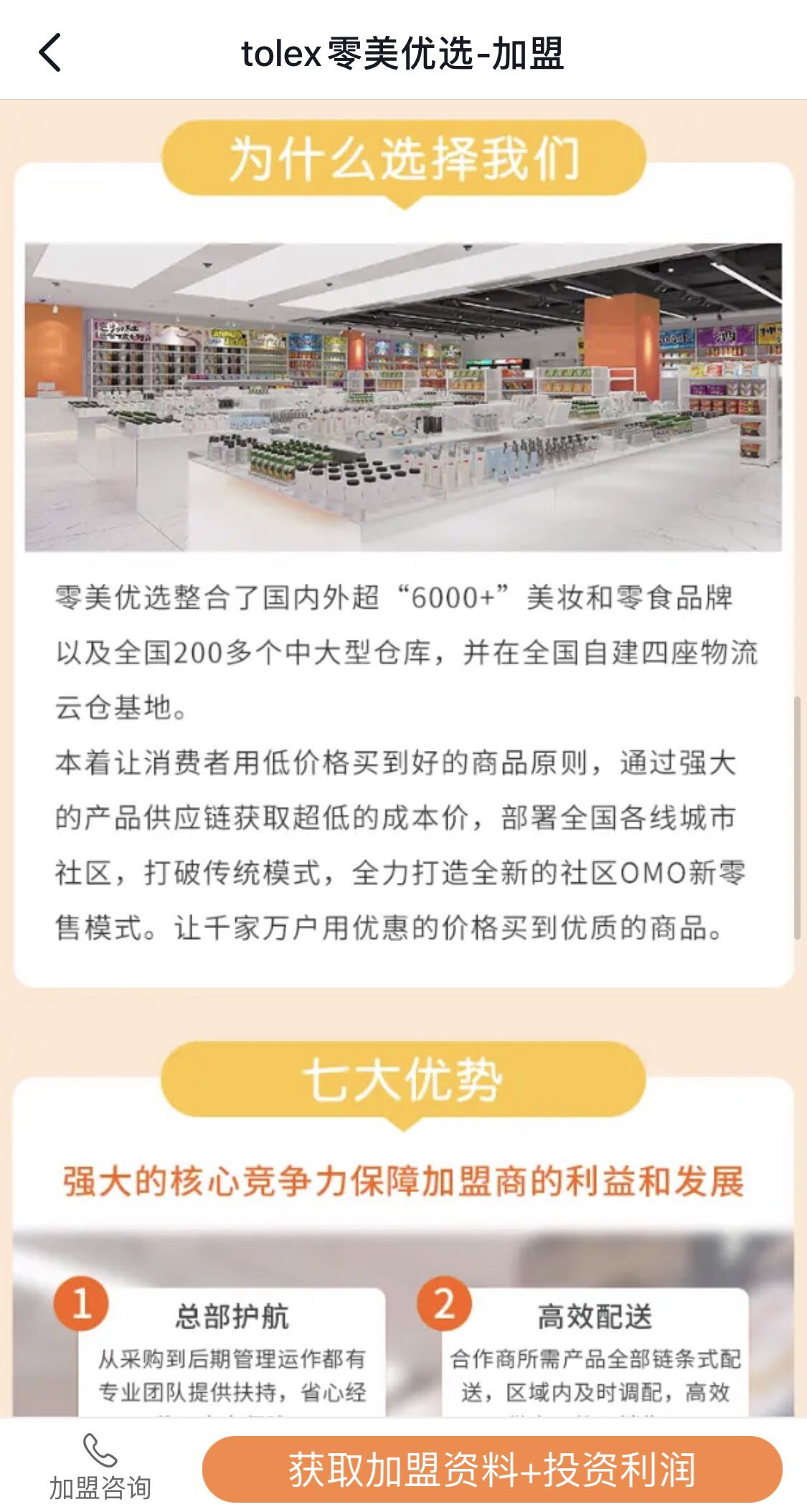 从公开的加盟信息来看,零美优选认为品牌的优势在于产品供应链的建设。零美优选着重强调了其在全国合作有200多个中大型仓库,并在上海、杭州、天津和郑州自建四座物流云仓基地。