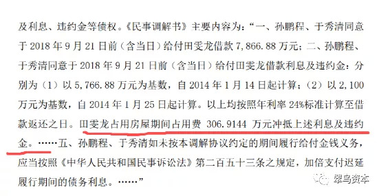 值得注意的是,虽然田雯龙是债权人,但他占用房屋期间占用费306.9万元冲抵这场纠纷的利息及违约金。
