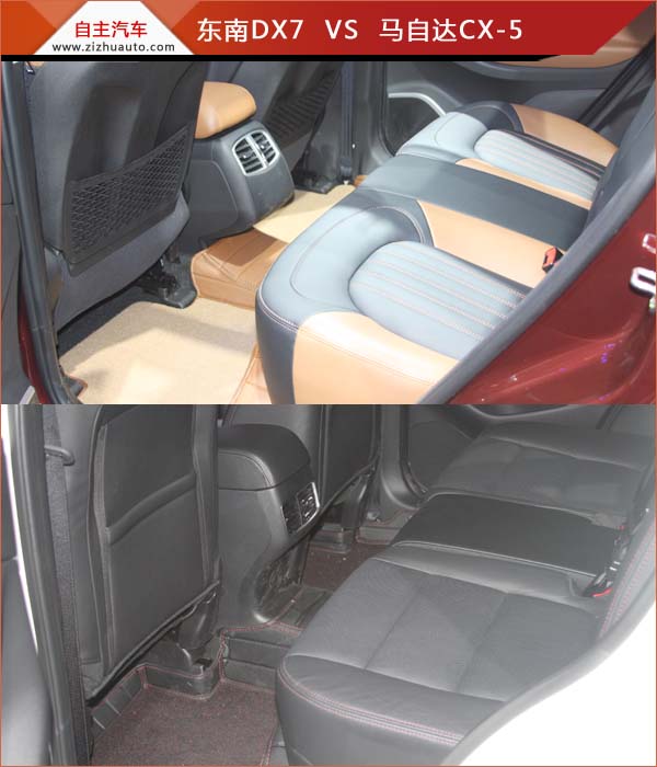 前排空间。两车前排空间都相对充裕。座椅材质上,东南DX7采用仿皮材料,马自达CX-5采用真皮材料,两车均为主驾驶座椅可电动调节。而差异就在于,马自达CX-5可以进行腰部支撑调节,东南DX7则可以进行第二排靠背角度调节。两车侧重点稍有不同,一个注重前排乘客感受,另一个则关注后排乘客乘坐舒适性。