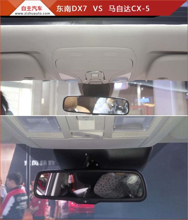 内后视镜。在内后视镜配置上,马自达CX-5比东南DX7多出内后视镜自动防眩目功能,在长途旅行时,这种贴心的小功能有时很重要。而略带遗憾的是,作为CX-5的顶配车型,却没有配备全景天窗,全景天窗在家庭用车购车时,是一项颇为重要的选项,相比之下,东南DX7则很有诚意。