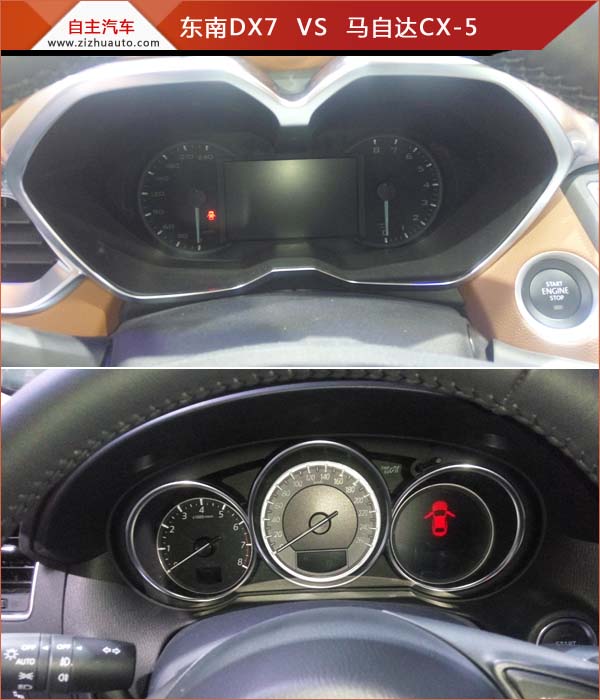 东南DX7的仪表盘的外观设计十分具有科技感。马自达CX-5则采用炮筒式设计。像:安全带未系提示、发动机电子防盗、无钥匙启动/进入系统、ABS防抱死、车身稳定控制等配置都会在仪表盘显示。而在一些性能配置上,东南DX7要比马自达CX-5更为突出,诸如胎压监测装置、自动驻车、陡坡缓降等功能。这点东南DX7可圈可点。