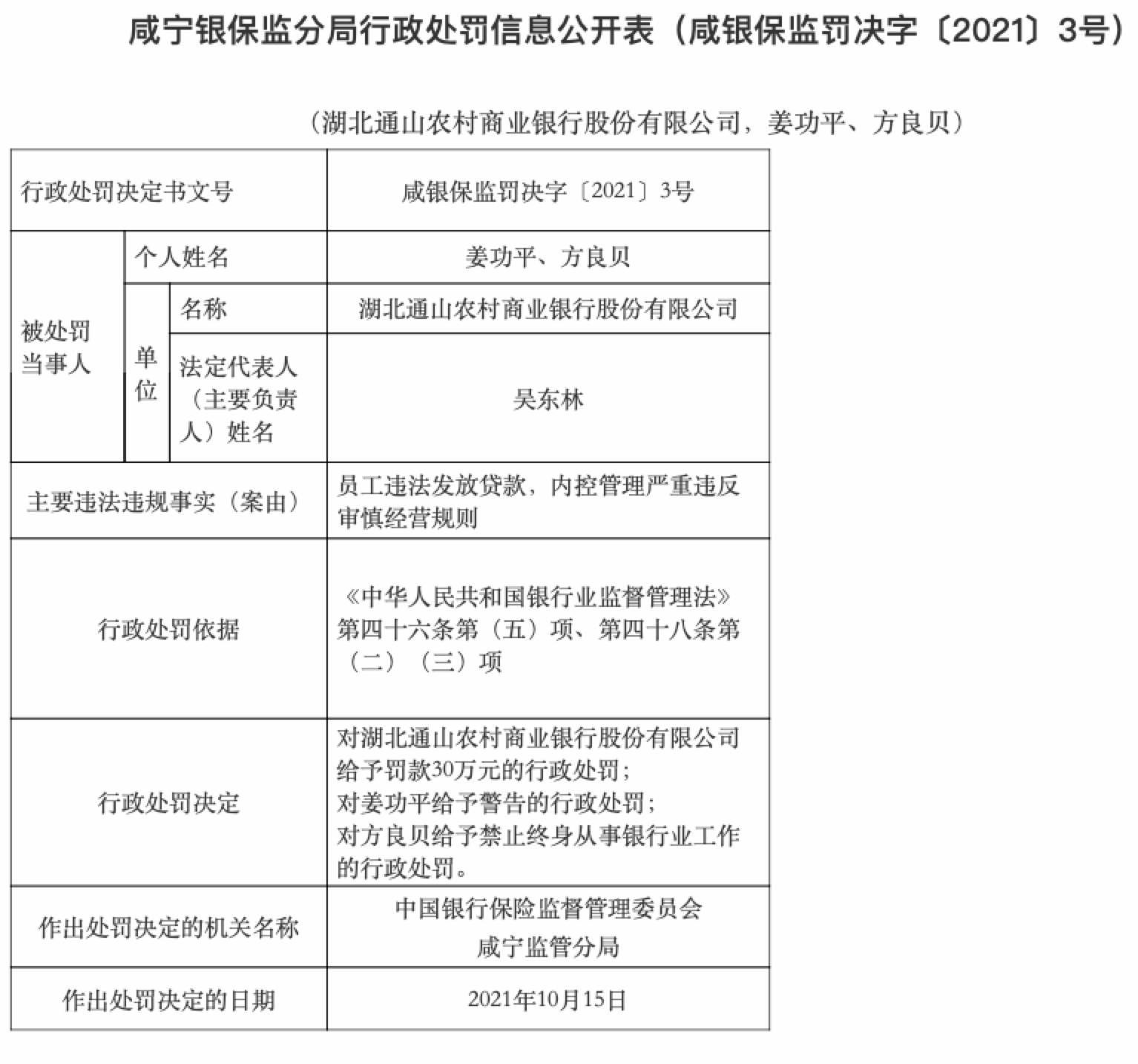 银保监会官网10月26日消息,咸宁银保监分局行政处罚信息公开表显示,湖北通山农村商业银行股份有限公司因员工违法发放贷款,内控管理严重违反审慎经营规则,被中国银行保险监督管理委员会咸宁监管分局罚款30万元。