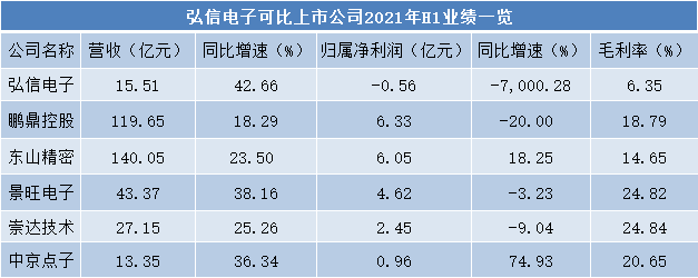 就拿弘信电子可比上市公司来说,2021年上半年净利润全部实现正增长,但鹏鼎控股、景旺电子、崇达技术净利润均有所下降。