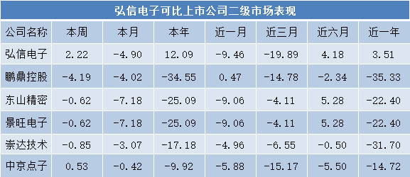 以弘信电子可比上市公司为例,2021年以来,弘信电子业绩虽然遭遇大滑坡,年内股价涨幅仍达到12.09%,其余上市公司股价均出现不同程度下挫,其中鹏鼎控股跌幅达到34.55%。