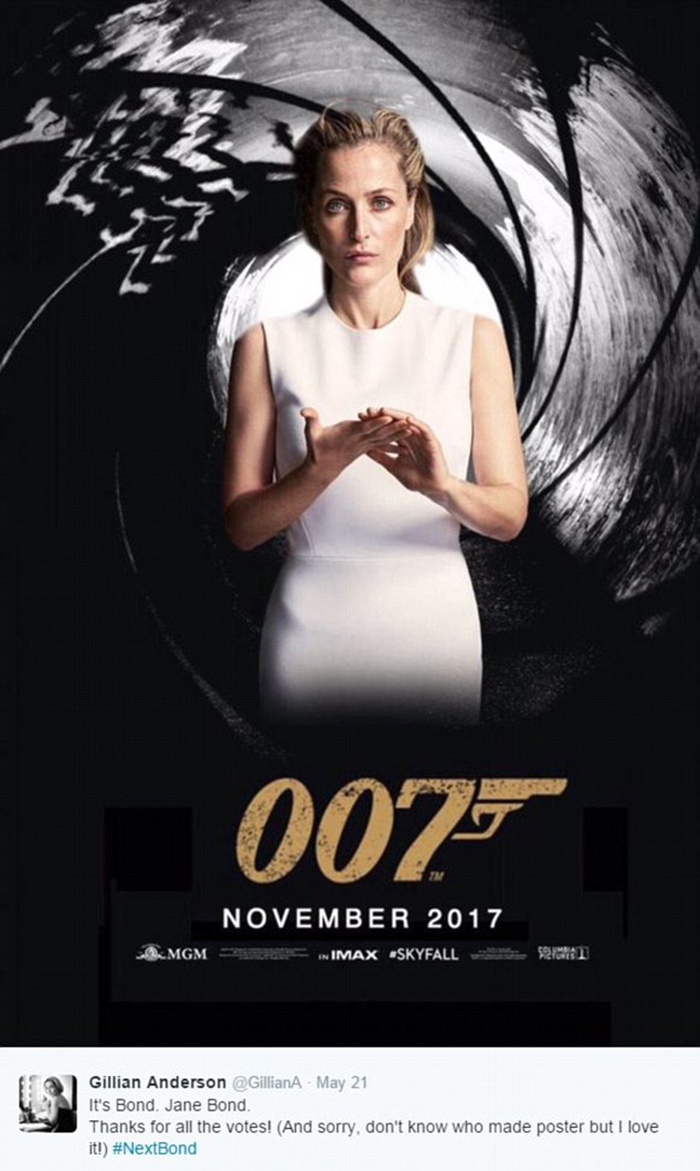 艾米莉亚不是第一个有邦德梦的女演员,在此之前,《X档案》女星吉莉安·安德森(Gillian Anderson)就在推特上转发了一张饭制的007海报,只是海报中的邦德变成了她本人。她附文道:“我是邦德,简·邦德,谢谢你们为我投票!(不好意思不知道这张图是谁P的但是我超喜欢!)”