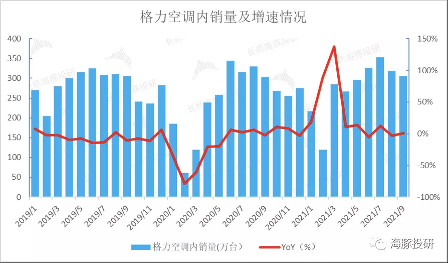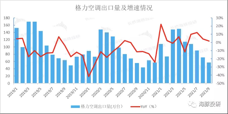 根据产业在线数据监测,格力空调 2021年1-9月间的内销累计出货量 YoY约15%,站在当前时点展望,长桥海豚君认为内需无明显更差的利空因素,后续出货或以平稳态势为主。