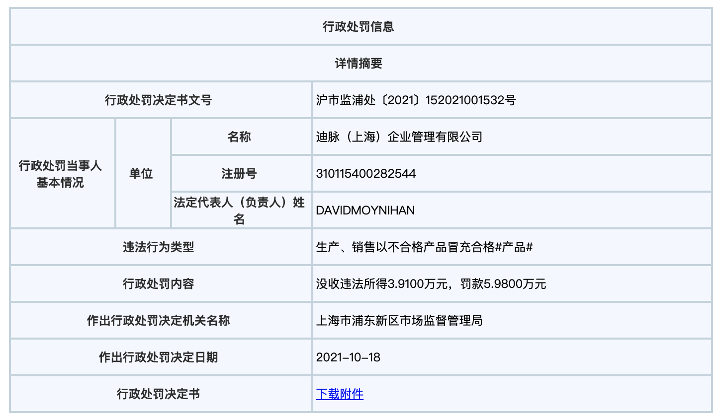 上海市市场监管局网站显示,10月18日,因生产、销售以不合格产品冒充合格产品,迪卡侬关联公司迪脉(上海)企业管理有限公司被没收违法所得3.91万,罚款5.98万。处罚单位为上海市浦东新区市场监督管理局。