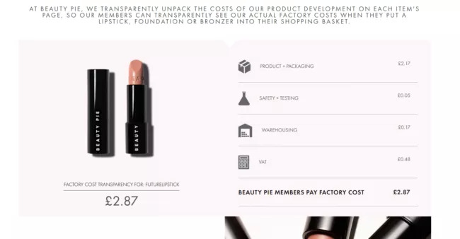 主打“低价”和“平民化”的Beauty Pie在对待产品价格上一度非常激进,会在官网的每件商品下面列明成本构成。例如一支售价2.87英镑的唇膏,产品和包装成本是2.17镑、测试成本0.05镑、仓储成本0.17镑、税费0.48镑,加起来刚好是2.87镑。卖这样一支唇膏可以说完全是赔本赚吆喝。