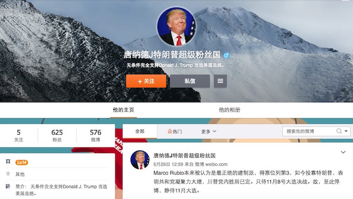 微博上出现了一系列诸如“床破粉丝团”、“唐纳德J特朗普超级粉丝国”的账号,粉丝量不断增加。其中,很多人评论都是使用大笑的表情或是粗鲁的笑话,还有用户力挺特朗普,表示“无条件支持川普冻蒜”。特朗普的女儿伊万卡·特朗普(Ivanka Trump)在新浪微博的账号拥有超过17000名粉丝。微博话题“帮川普大叔上头条”的阅读量已经超过1700万。