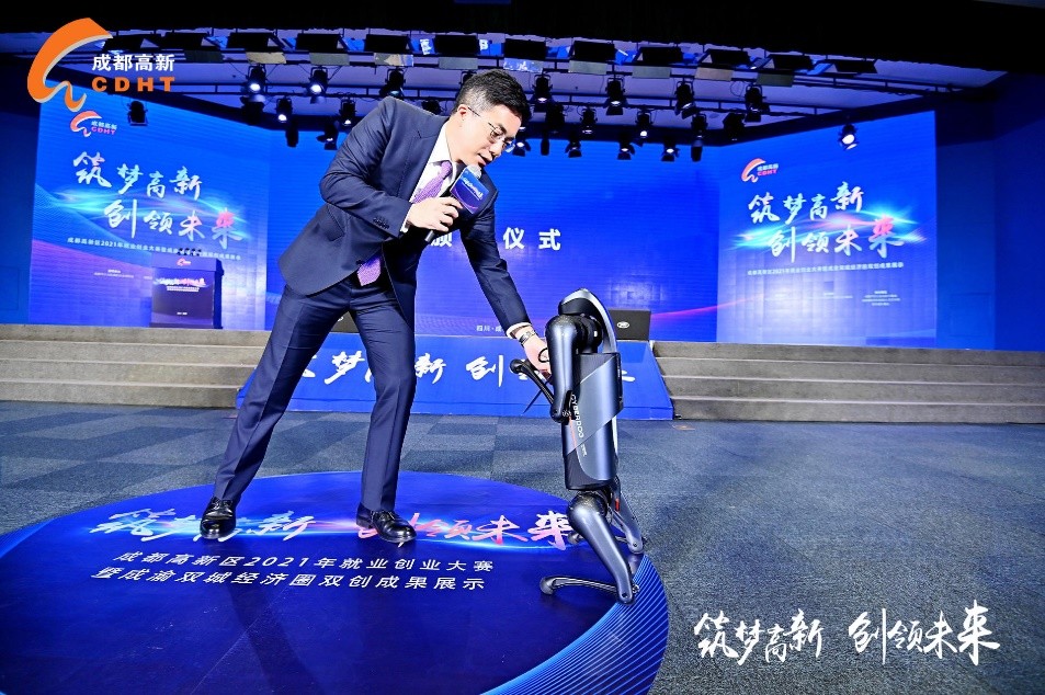 随后,来自阿木实验室的机器狗为主持人送上了成都高新区2021年就业创业大赛获奖名单,现场为大赛一、二、三等奖进行了隆重的颁奖典礼。