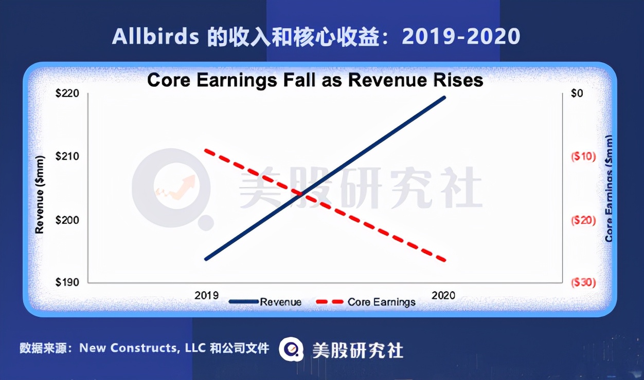 不可否认的是,Allbirds成立至今仍未盈利。2020年受疫情影响,其销售得益于休闲服装和鞋类的需求,但核心收益仍从2019年的900万美元下降到2020年的-2600万美元
