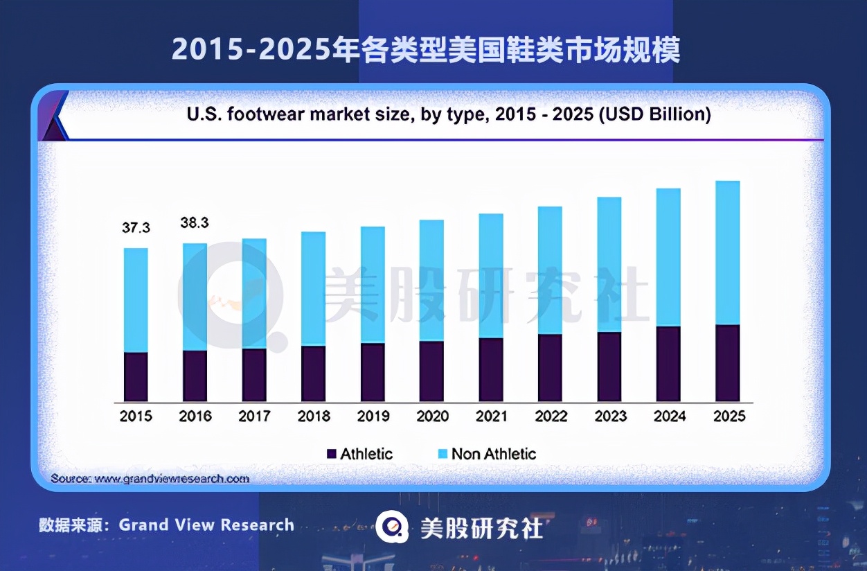 根据Grand View Research的 2019 年市场研究报告,2018 年全球各类鞋类市场估计为 2076 亿美元,预计到 2025 年将达到 2700 亿美元,即2018年至2025年的预测符合年增长率为3.8%。