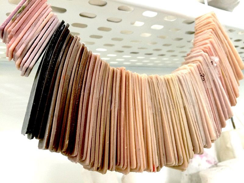 精打细磨是制作仿真假肢必不可少的过程,在Sophie工作室的墙壁上悬挂着这样一串类似皮肤组织的东西,她称之为色板,为了使假肢的皮肤的颜色尽可能与顾客原本肤色相匹配,她要从这94种肤色样板中选出与之最为接近的,通过混合,制作出最符合顾客真实条件的皮肤状态。