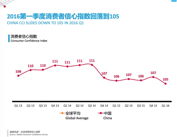 根据绩效管理公司尼尔森今日发布的报告,2016年第一季度中国消费者信心指数达到105,比上一季度回落2点。尽管105点是2013年以来的历史低位,但中国消费者信心指数仍然在全球排在第六位的高位。