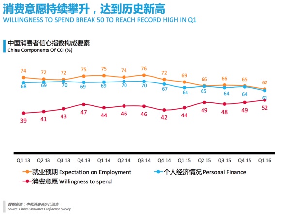 不过,在三个主要测量指标中,尽管中国消费者的就业预期和个人经济情况都有小幅下滑,但消费意愿一路高涨,达到2013年以来的高点。
