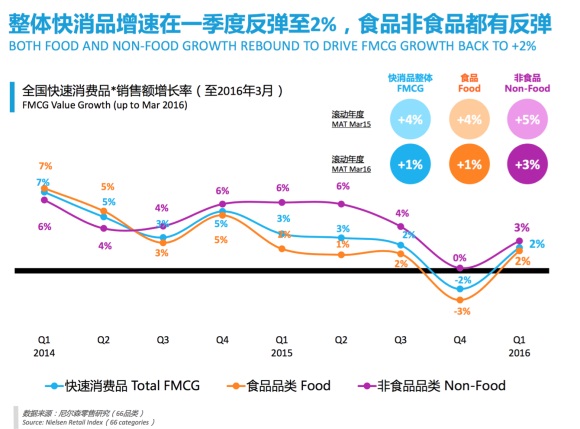 得益于春节期间的旺季,大卖场等渠道销售回暖,一季度中国快消品整体增速反弹至2%,食品与非食品品类均超过上一季度。不过与去年同期相比,快消品增速仍有下降。许丽平表示,在2015年,春节当月为大卖场渠道贡献的销售额已经超过10%,这部分是因为节日期间快递休假,为大卖场等线下渠道提供了喘息之机,未来线下渠道仍将面临来自电子商务的挑战。