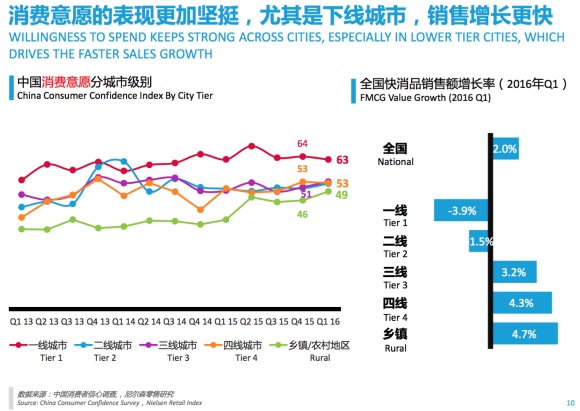 尼尔森大中华区总裁严旋表示:“虽然中国消费者信心指数在第一季度有所回落,但预计在未来不会有大的波动。因为中国的经济基本面依然强劲,人们的收入逐步改善,消费意愿依然强劲,尤其下线城市的消费增长迅速。”