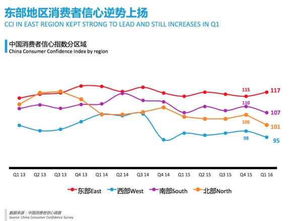 从区域上看,尽管中国整体消费信心略有下挫,但经济较发达的东部地区的消费者信心指数逆势上涨,从2015年第四季度的115点提高到117点。东部消费者的个人经济状况预期更加乐观,71%的东部地区受访者表示他们对目前的个人经济状况预期好或者非常好,76%的人对未来的经济状况持乐观态度,表示对未来12个月的个人经济状况预期好或者非常好。同时,东部消费者倾向于更加频繁地购买服饰、外出就餐、旅游度假等享受型消费。