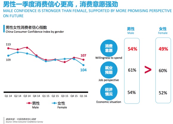 此外,尼尔森研究指出,2016年第一季度,中国男性的消费意愿明显超过女性(54-49),男性高涨的消费热情主要是源自他们对就业前景和个人经济状况更好的预期。