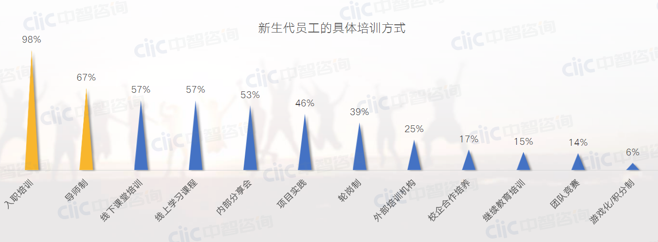 从培养新生代员工的具体方式来看,入职培训几乎是企业必选的培训方式之一。报告显示,近七成企业会选择导师制,为新生代员工匹配有经验的老员工带教。