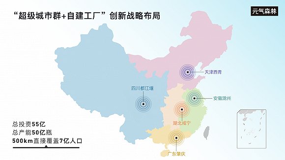 自2019年至今的三年时间内,元气森林针对华北、华东、华南、华中、西南地区5大城市集群布局了5大工厂,重点对应京津冀、长三角、粤港澳大湾区、川渝、两湖中南地区市场。
