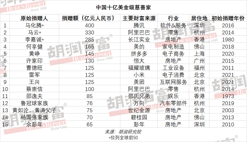 放眼国内,有15位中国慈善家在最近100年都捐出了10亿美金以上,其中12位在世,3位已去世。马化腾以400亿捐赠总价值位列第一,其他还有曹德旺、何享健、鲁冠球、邵逸夫,以及中国裸捐第一人余彭年等。