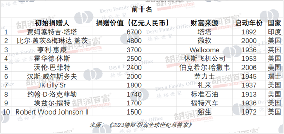 10月28日,胡润研究院携手德裕世家联合发布《2021德裕·胡润全球世纪慈善家》,列出了最近一百多年中全球捐赠价值最高的慈善家。捐赠总价值包括慈善家成立的慈善基金会当前的资产价值和迄今为止捐赠的价值之和,不包含承诺的捐赠。