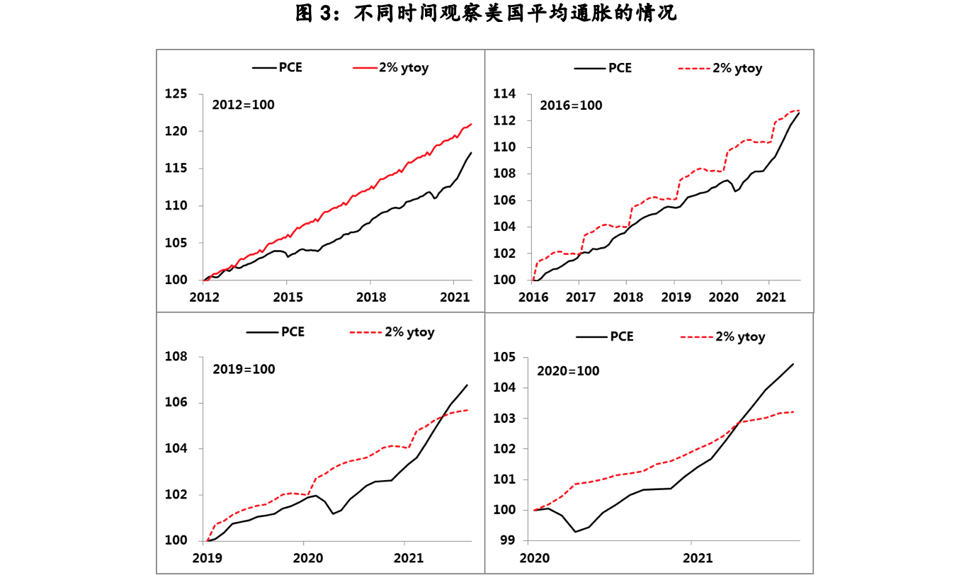 因为随着观测时间期点的不同,平均通胀的观测结果差别会很大。例如,分别以2012年政策框架首次确立年、2016年对称通胀目标确认年、疫情前的2019年和疫情爆发的2020年为不同起点,来观察通胀实际曲线和以2%通胀幅度模拟出通胀达标曲线的变化,可以发现,由于观察起点不同带来的差异,对应着政策路径也就大相径庭了: