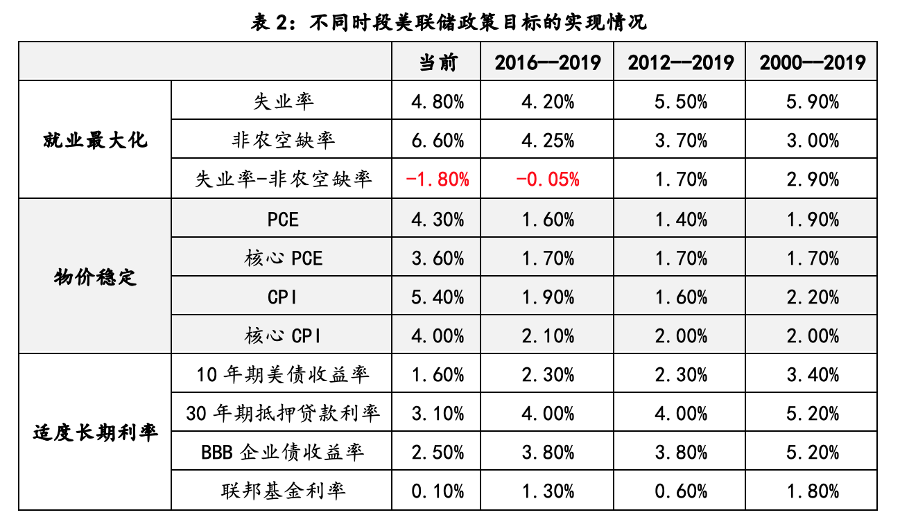 在2020年调整政策框架之前,实际上在2016年1月份,美联储就曾将2%通胀目标进一步修订为对称通胀目标(symmetric inflation goal),即将原来2%作为通胀上限政策路径,转变为容忍通胀围绕2%中值上下浮动,其实此变化已显露出美联储开始考虑提高通胀的容忍度。到了2020年8月新政策框架确立,美联储就将2%通胀目标正式修订为“一段时间内实现通胀平均水平为2%”,即当通胀持续低于2%一段时期后,货币政策容忍通胀在一段时间内略高于2%。