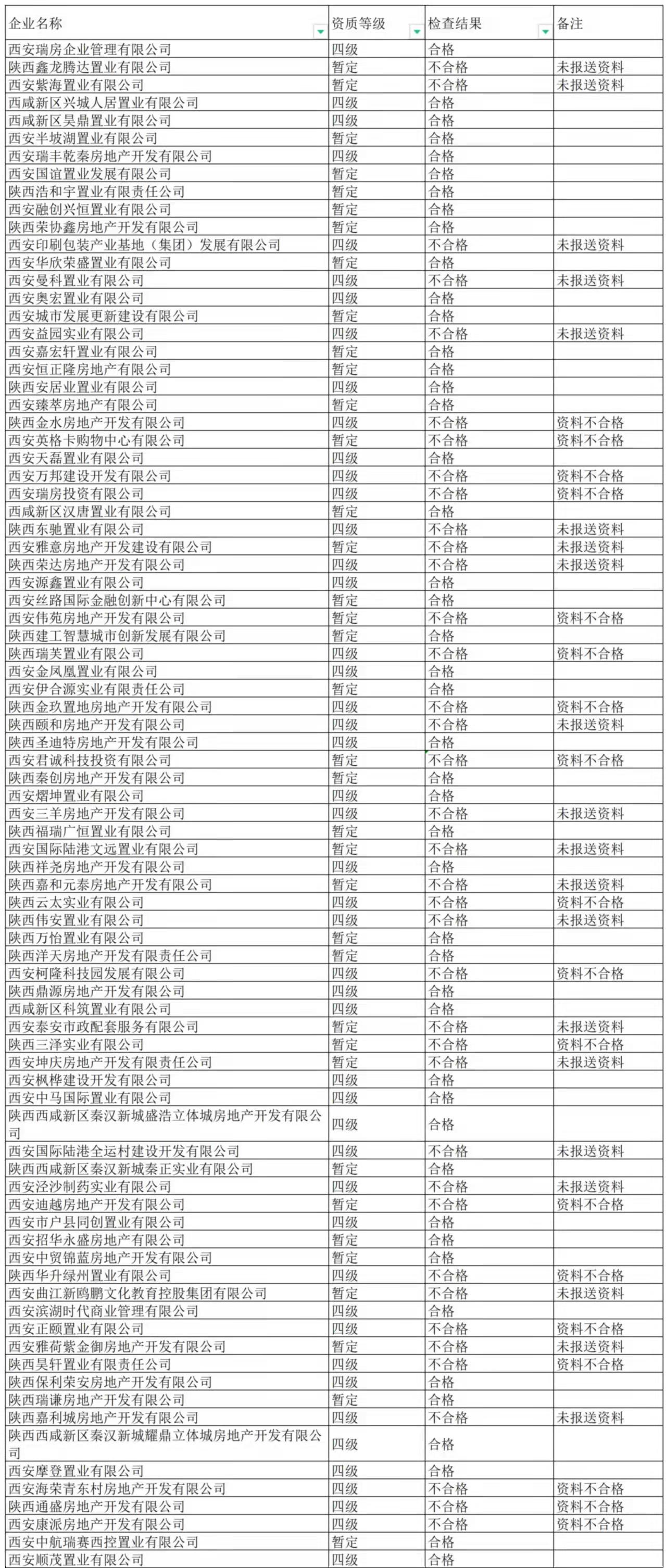 现依法责令检查结果为不合格的企业进行整改,应于11月26日前整改完毕。各有关房地产开发企业应于11月26日前向西安市住房和城乡建设局上报具体整改落实情况(发送整改情况到邮箱xazjj_kfc@xa.gov.cn)。对在规定整改时间内仍未达到房地产开发企业资质标准要求条件,将依法对其作出处理,并将该行为作为其不良信用信息记入房地产开发企业信用档案。