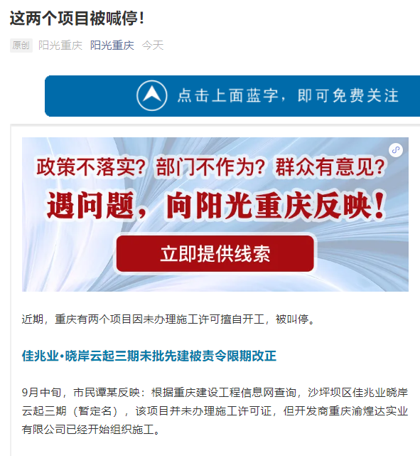10月28日,重庆市网络问政平台阳光重庆公布,重庆佳兆业·晓岸云起三期因未办理施工许可擅自开工,被叫停,责令限期改正。