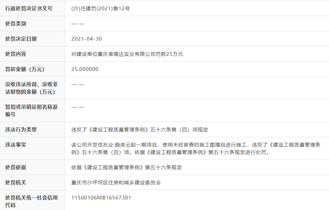 今年4月30日,沙坪坝区住房和城乡建设委员会公布两份对佳兆业·晓岸云建设单位重庆渝煌达实业有限公司的处罚决定书。该公司因在开发佳兆业·晓岸云起一期项目和二期项目时,使用未经审查的施工图擅自进行施工,被沙坪坝区住房和城乡建设委员会共处罚金50万元。