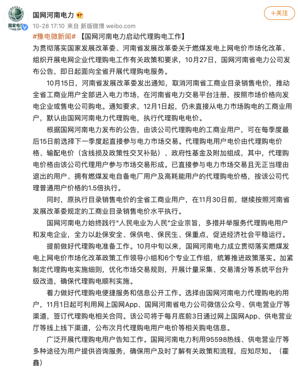 @国网河南电力 微博消息,为贯彻落实国家发展改革委、河南省发展改革委关于燃煤发电上网电价市场化改革、组织开展电网企业代理购电工作有关政策和要求,10月27日,国网河南省电力公司发布公告,即日起面向全省开展代理购电服务。由该公司代理购电的工商业用户,可在每季度最后15日前选择下一季度起直接参与电力市场交易。